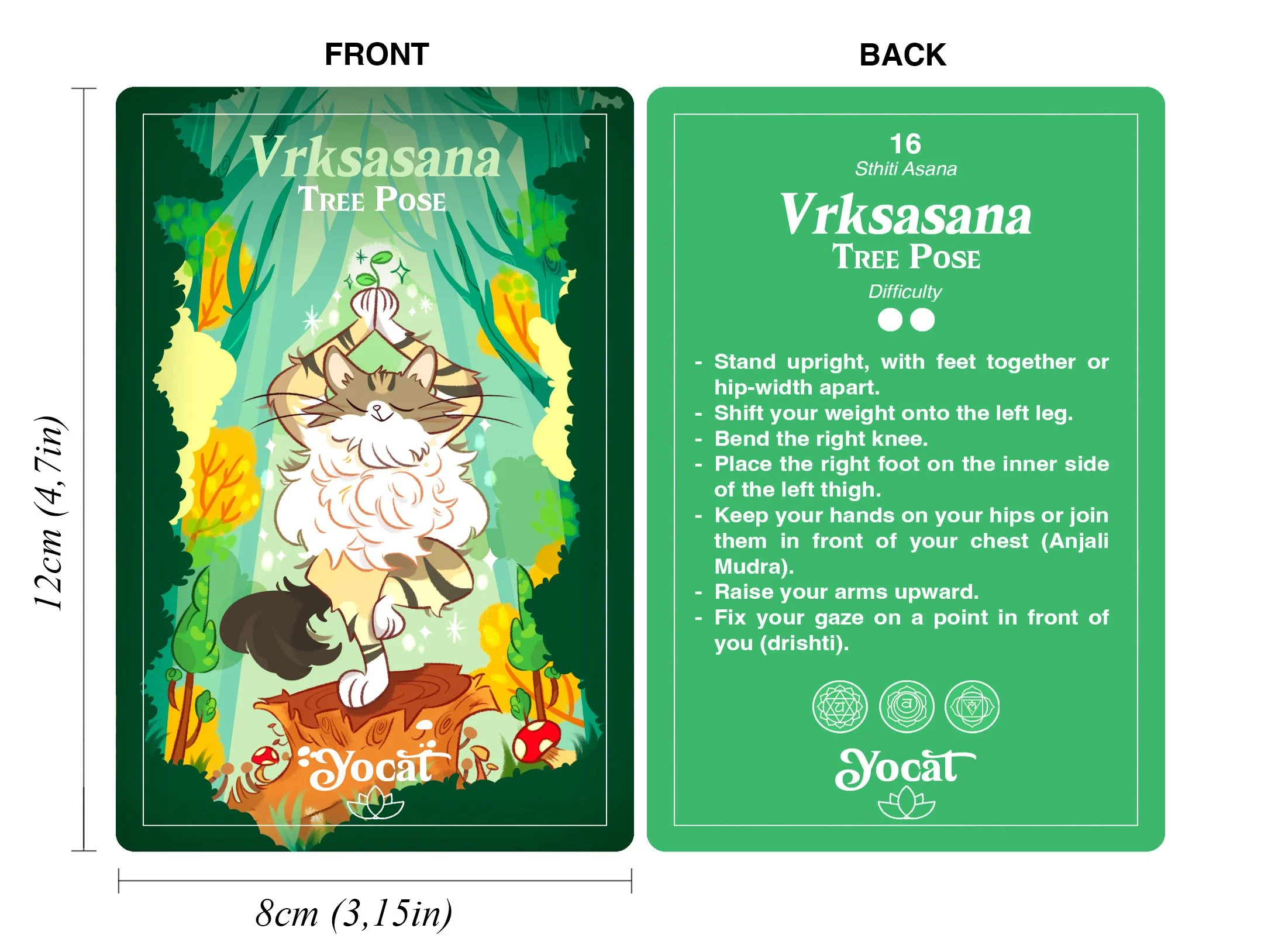 Sul fronte: l’illustrazione dell’asana, il nome in sanscrito (con pronuncia) e la traduzione in inglese.